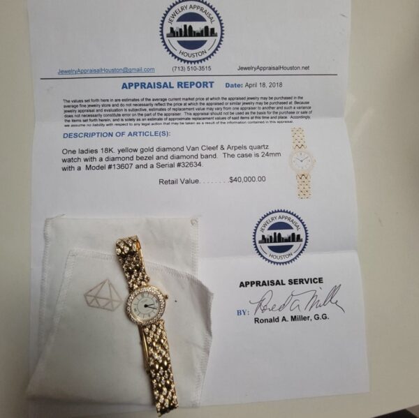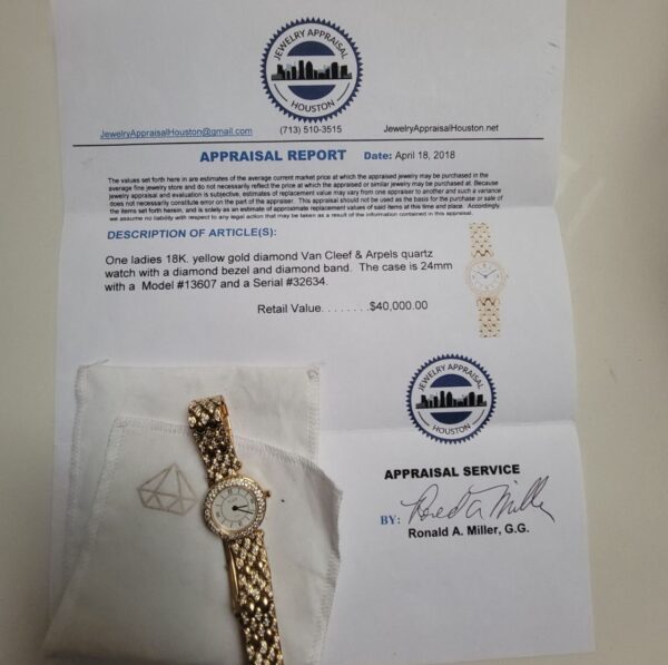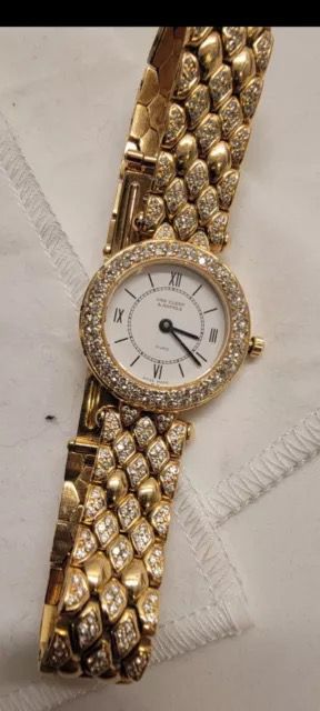 Cette montre-bracelet Van Cleef & Arpels incarne l’alliance du savoir-faire horloger et de l’excellence joaillière. Son boîtier en or jaune 18 carats de 24 mm, ceinturé d’une lunette entièrement diamantée, contraste élégamment avec son cadran noir aux chiffres romains.