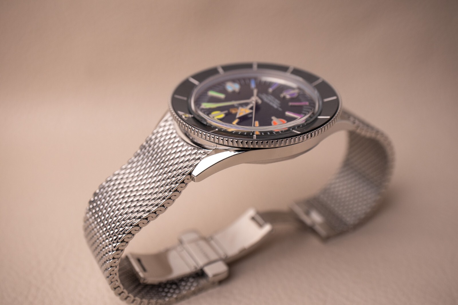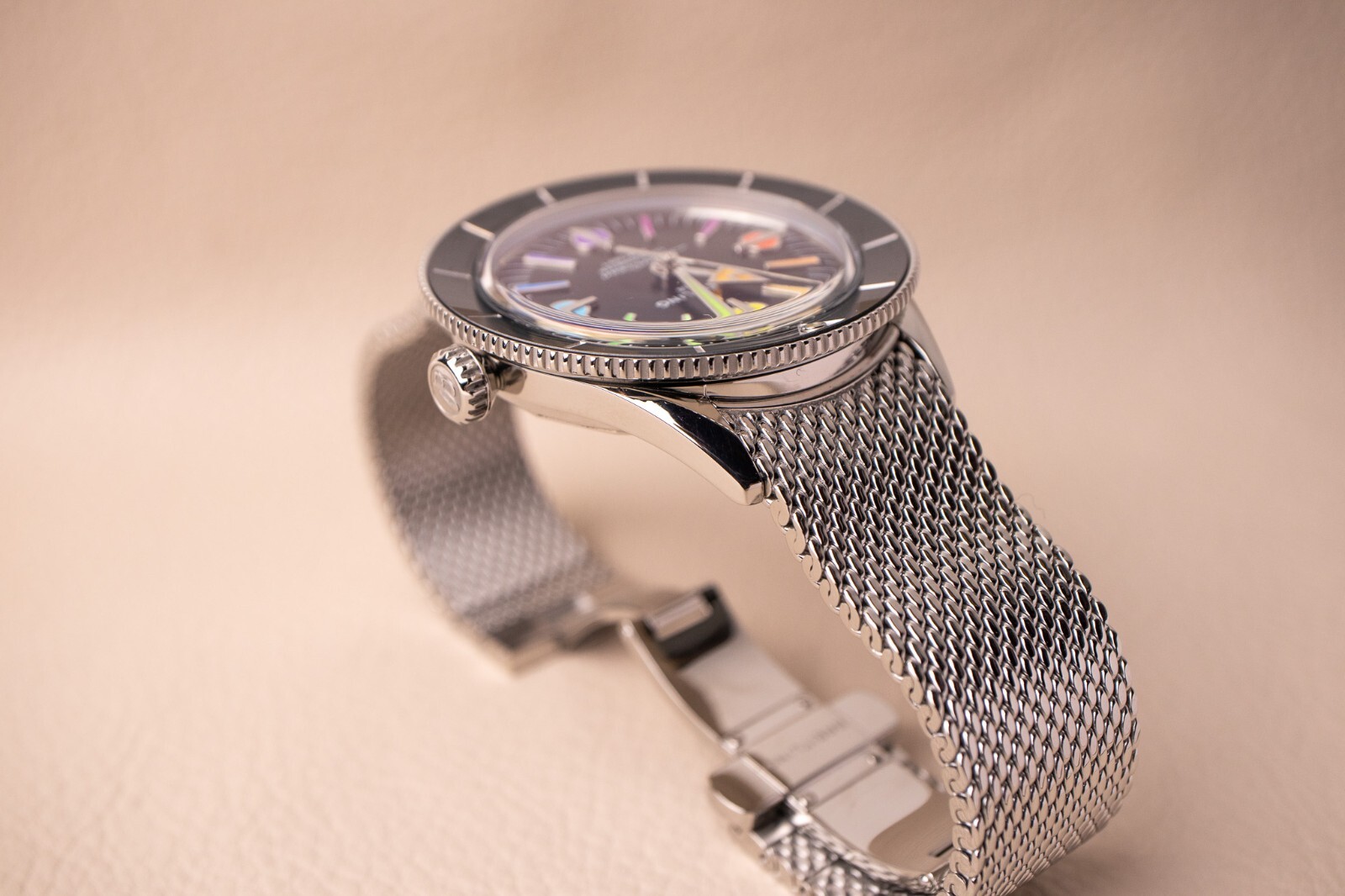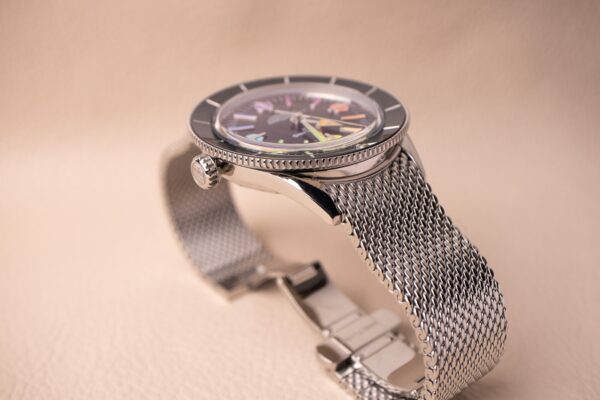 Taille du boîtier : 42 mm x 9,9 mm d’épaisseur x 46 mm d’une corne à l’autre