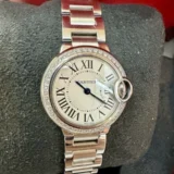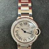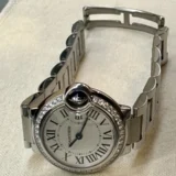 Montre Cartier Ballon Bleu de Cartier 28 mm, lunette sertie de diamants (0,48 carat), W4BB0030. Boîtier en acier inoxydable de 28 mm et lunette sertie de diamants (0,48 carat), le tout sur un bracelet en acier. Cette montre pour femme est dotée d’un cadran argenté avec aiguilles en acier bleui et chiffres noirs. Étanche jusqu’à 30 m, elle est dotée d’un verre saphir. Mouvement à quartz.