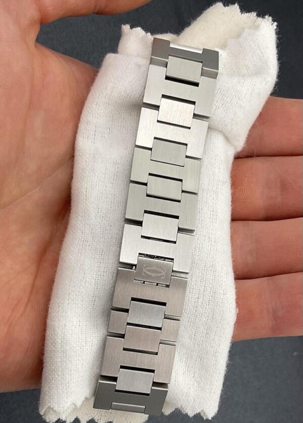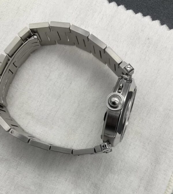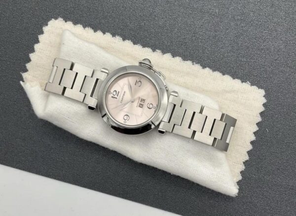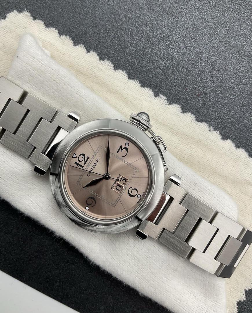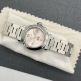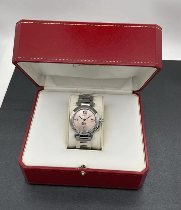 État : Occasion – Bon état. Matériau du bracelet : Acier inoxydable. Mouvement : Mécanique (automatique). Couleur du cadran : Rose. Avec papiers : Oui. Année de fabrication : 2000-2009. Référence : 2475. Marque : Cartier. Type : Montre-bracelet. Catégorie : Femme. Modèle : Cartier Pasha. Avec boîte/emballage d’origine : Oui. Avec manuel/livret : Oui. Matériau du boîtier : Acier inoxydable. Affichage : Analogique. Montre automatique Cartier Pasha d’occasion en acier inoxydable, cadran rose.