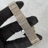 La montre est montée sur son bracelet Cartier d’origine. J’adore ce style avec ses vis dorées qui contrastent joliment avec le bracelet en acier. Elle est en très bon état, avec seulement quelques légères rayures, rien de grave.
