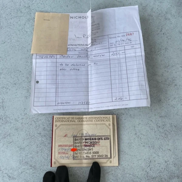 Voici une spectaculaire Cartier Santos Carrée de 1996, livrée avec son ensemble complet et son historique d’entretien chez Cartier. Elle a récemment bénéficié d’un entretien complet chez Cartier en 2022 et fonctionne toujours parfaitement en 5 secondes sur 24 heures. Il est rare de trouver un ensemble complet aussi complet et dans un tel état, et nous avons eu la chance de l’acquérir auprès de son propriétaire d’origine. Plus de détails ci-dessous :