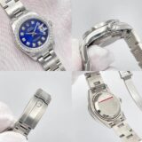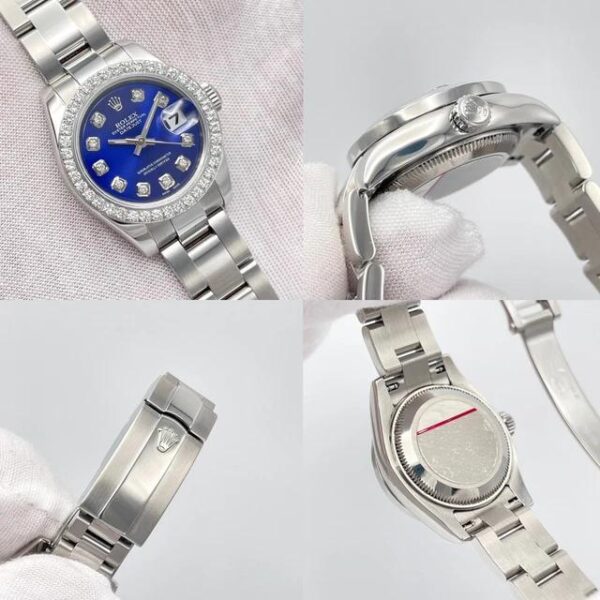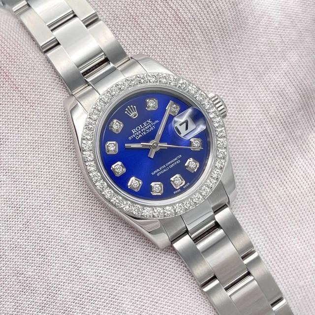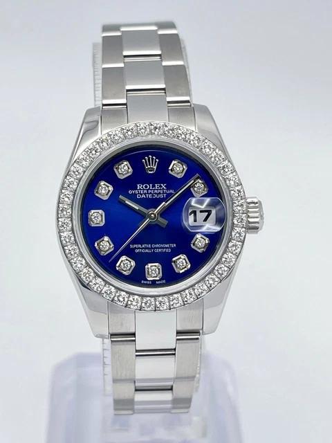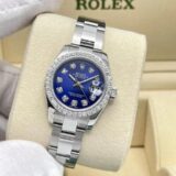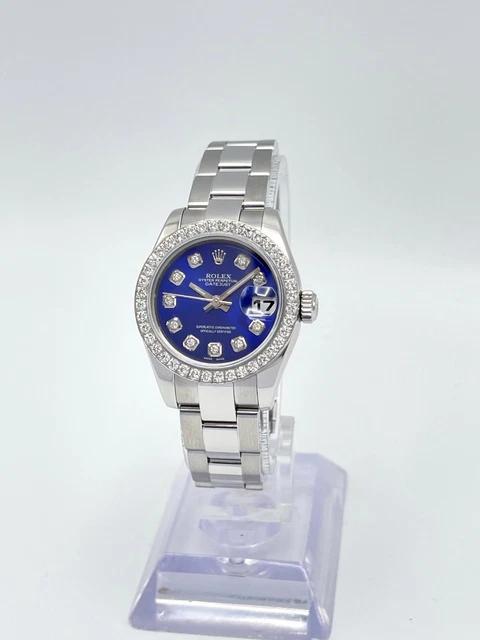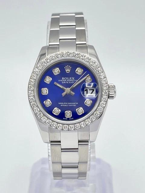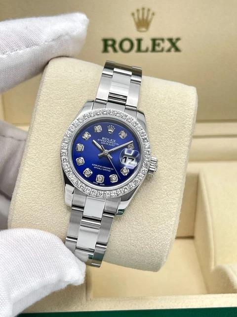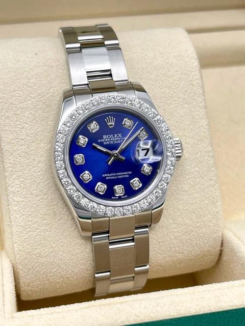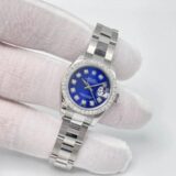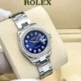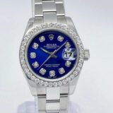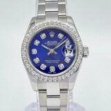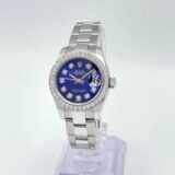 Cette Rolex Datejust dames séduit par son cadran bleu profond entièrement diamanté, créant un contraste saisissant avec sa lunette sertie de 0,8 carat. Son boîtier acier de 26 mm et son bracelet Oyster forment un écrin sobre qui met magnifiquement en valeur l’intensité de la couleur et le scintillement des pierres.